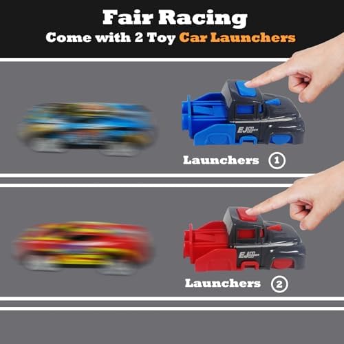 【Innovative Launcher Design】- This set features two uniquely designed car-shaped launchers, operated by a simple press-down mechanism, making car launching easy and ensuring fair play and fun.
