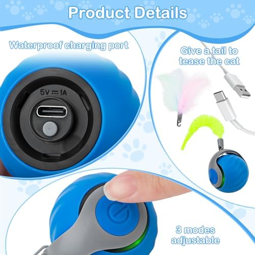 Batterie 300mAh:Équipée d’une batterie rechargeable au lithium de 300 mAh, cette balle de jeu interactive offre jusqu’à 120 minutes de jeu par charge. Conseils : Chaque balle électrique pour chat est testée avant d’être expédiée et consomme une certaine quantité d’électricité. Veuillez utiliser la prise de charge USB C pour la recharger complètement avant de l’utiliser.