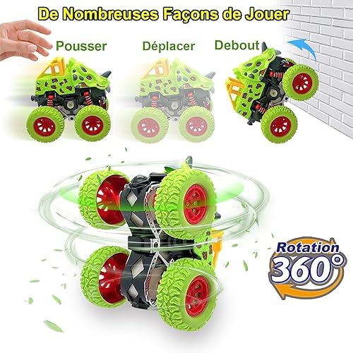 【Stunt de Rotation Cool à 360 Degrés】Une fois poussés et mis en position, les jouet garcon 2 3 ans Monster Truck dinosaures pour garçons effectueront un impressionnant stunt à 360 degrés que votre enfant adorera regarder. Ils seront émerveillés par la façon dont leurs voitures jouet enfant 2 ans ont l’air cool lorsqu’elles réussissent le stunt.