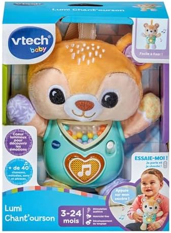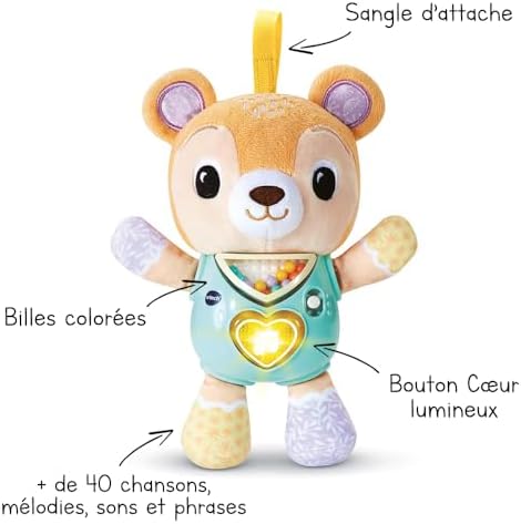 En appuyant sur le CŒUR LUMINEUX situé sur le ventre de ce nounours, l’enfant entend des chansons, des mélodies et de courtes phrases amusantes sur cet animal !