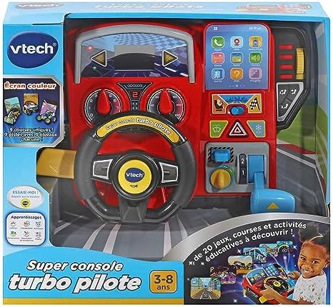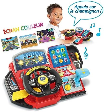 Super console turbo pilote est la console idéale pour devenir un vrai pilote dès 3 ans ! Différents éléments réalistes : un volant, un klaxon, un clignotant, un levier de vitesse, un bouton feu de détresse… tout pour bien s’amuser en imitant les plus grands ! 3 modes de jeu sont inclus : Apprentissages avec différentes missions, Course avec 3 circuits différents et Jeu libre avec la reproduction d’une vraie situation de conduite autour de différents lieux où l’enfant doit conduire ses amis virtuels. Les 20 jeux inclus permettent à l’enfant de faire le plein d’apprentissages : chiffres, calcul, additions et soustractions, résolution de problèmes, alphabet, phonétique, couleurs et animaux. Le bouton Turbo permet de faire accélérer la voiture dans les jeux. 12 applications et fonctionnalités sont présentes sur le tableau de bord et viennent déclencher des interactions sur l’écran : téléphone, pilotage automatique, GPS, radio, klaxon, vitesse, clim, clignotants, essuie-glace, aide, progrès, volume, etc. Écran couleur LCD de 2,4″, volant pour naviguer, klaxon pour sélectionner l’activité. 6 mélodies incluses. Réglage du volume sonore et arrêt automatique du jouet pour préserver la durée de vie des piles. Fonctionne avec 4 piles LR6-AA fournies. Cadeau enfant idéal dès 3 ans, pour garçon et fille.