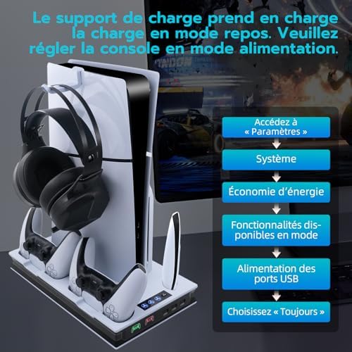 Sleep Mode Compatibility: This dock supports charging in standby mode. Please configure the USB ports on the PS5 console to always provide power. Go to PS5 Settings, then go to System > Power Saving > Standby Functions > Power USB ports, and select Always.